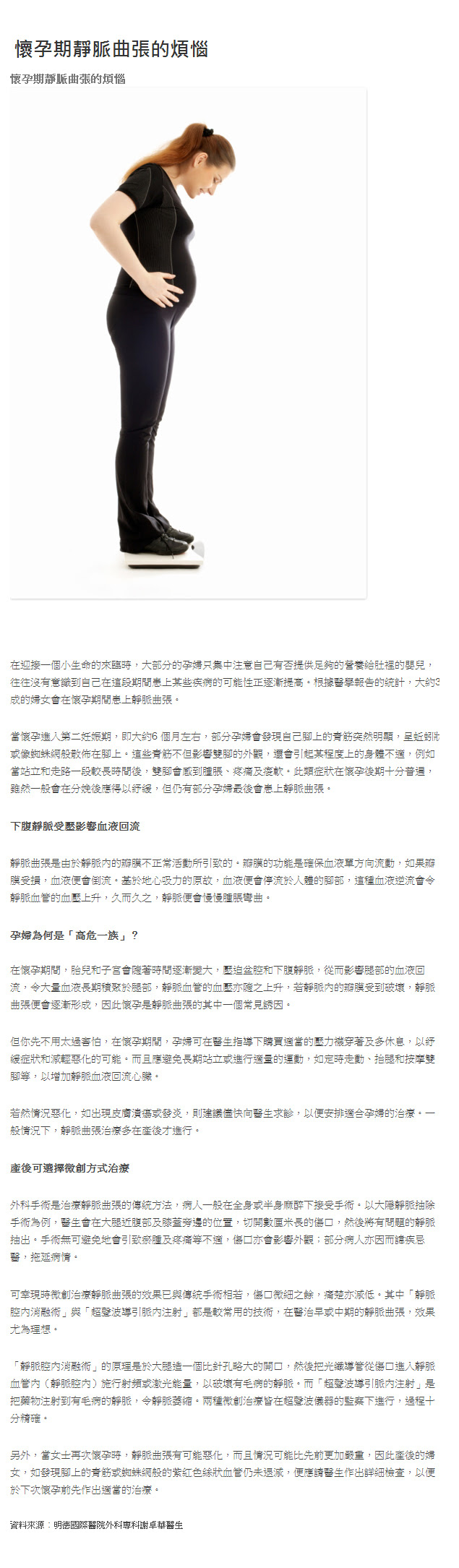 另外,當女士再次懷孕時,靜脈曲張有可能惡化,而且情況可能比先前更加嚴重,因此產後的婦女,如發現腳上的青筋或蜘蛛網般的紫紅色絲狀血管仍未退減,便應請醫生作出詳細檢查,以便於下次懷孕前先作出適當的治療。